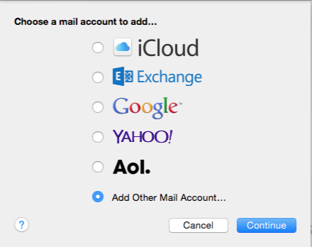 - Choose “Add Other Mail Account…” as the type of new account and click Continue.