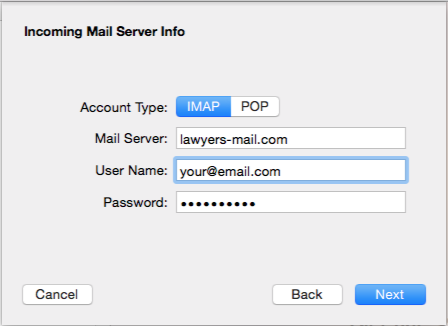 - Choose an Account type (we recommend IMAP), enter your mail server as lawyers-mail.com, your user name as your full email address, and your password should be in place from the previous screen. Click Next.
