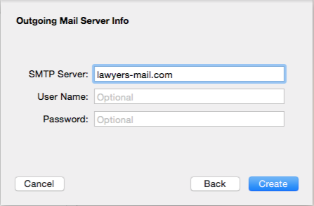 - Fill in the Outgoing Mail Server as lawyers-mail.com. You can leave the optional fields blank. Click Create.