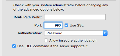 - Port 143 (seen above) is the default, but if that is not working for you, replace it with 993. Make sure Use SSL is checked and Authentication is set to “Password”. If pulling down Password prompt you for a user id and password, use your full email and password.